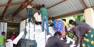 Workers at Sigor Wei Wei Irrigation Scheme in West Pokot County during shelling of seed maize on August 04, 2021.