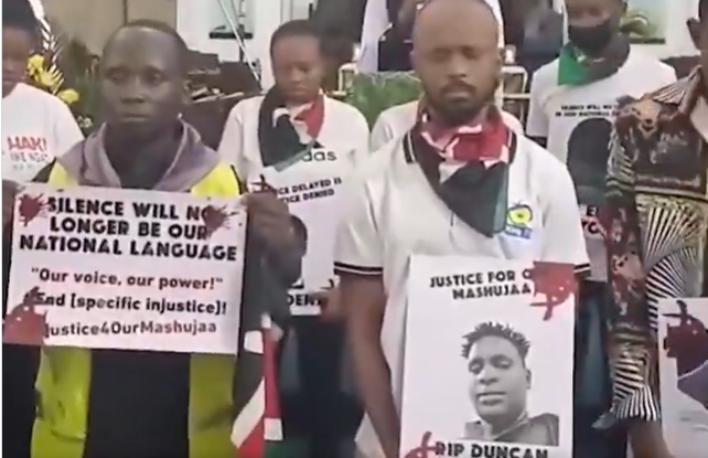 “Justice for our Mashujaa,’’ reads another portrait carried during the church service.