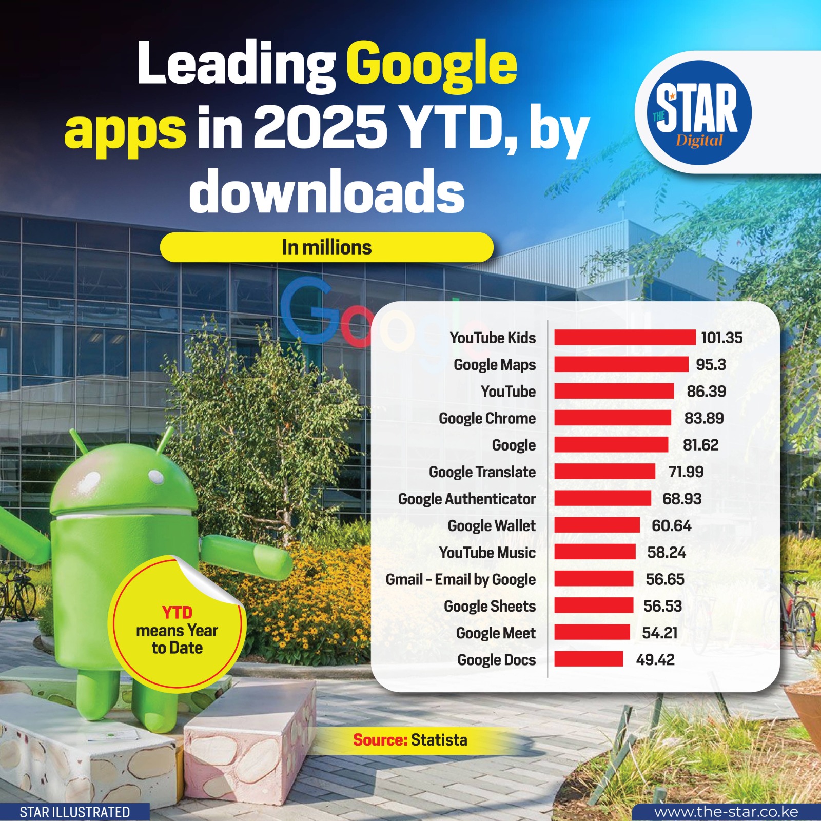 The main YouTube app remains a powerhouse, securing third place with more than 90 million downloads, while Google Chrome and Translate round out the top five, underscoring the need for fast browsing and multilingual communication.