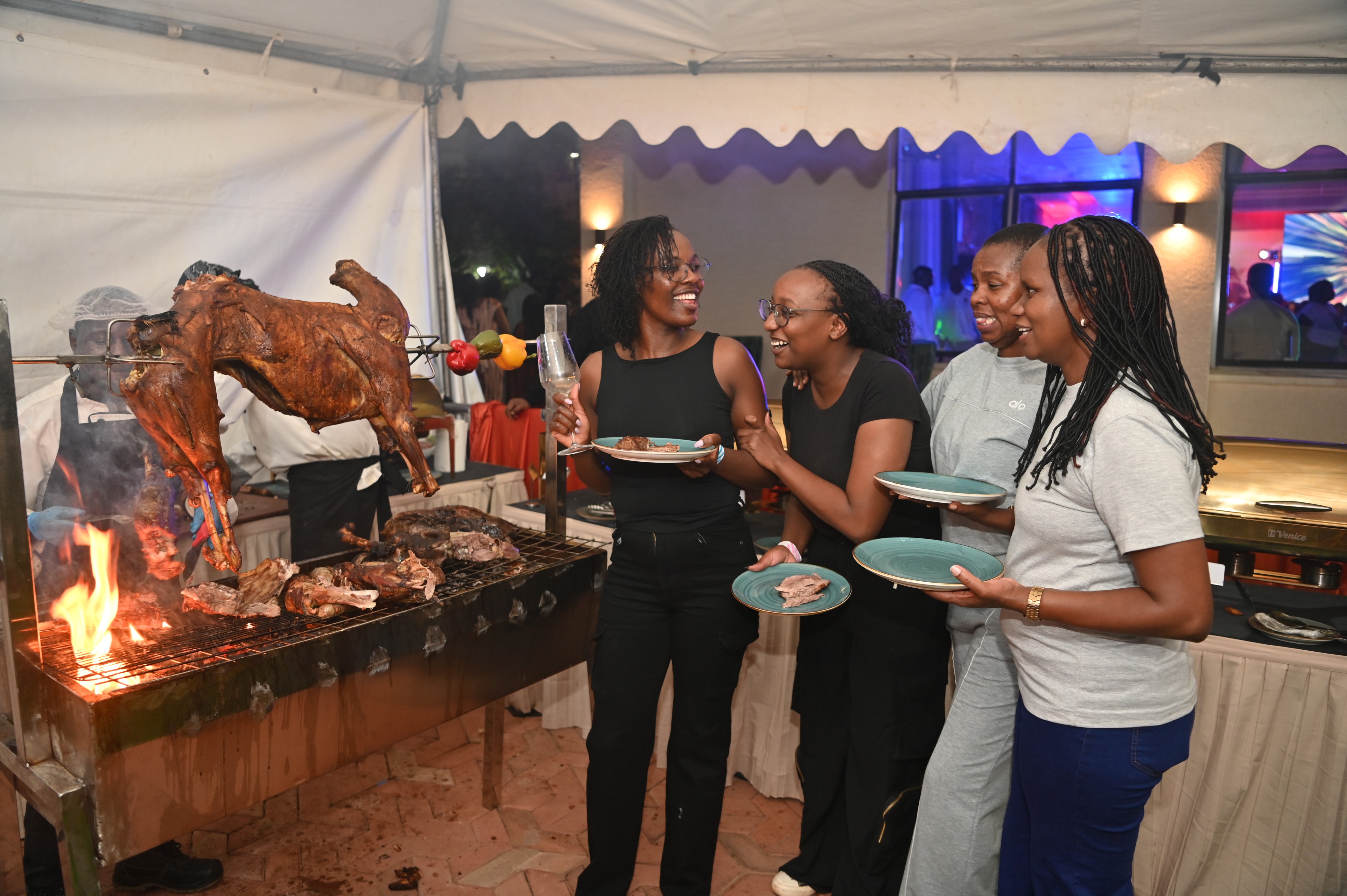 Moments of joy and connection as Muthoni wa Kirumba joins guests at Paramount Hotel Kigali, Rwanda during the launch of Choma Zone, enjoying laughter, great company, and a live barbecue experience. Photo: John Muchucha/poll