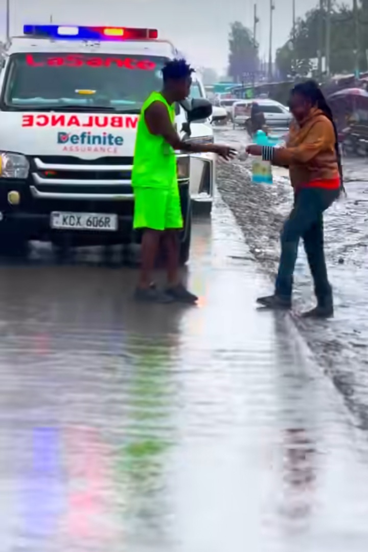 In a vivid video shared on his social media, Omondi is seen completely drenched. Water streams down his face, nearly blinding him at times.