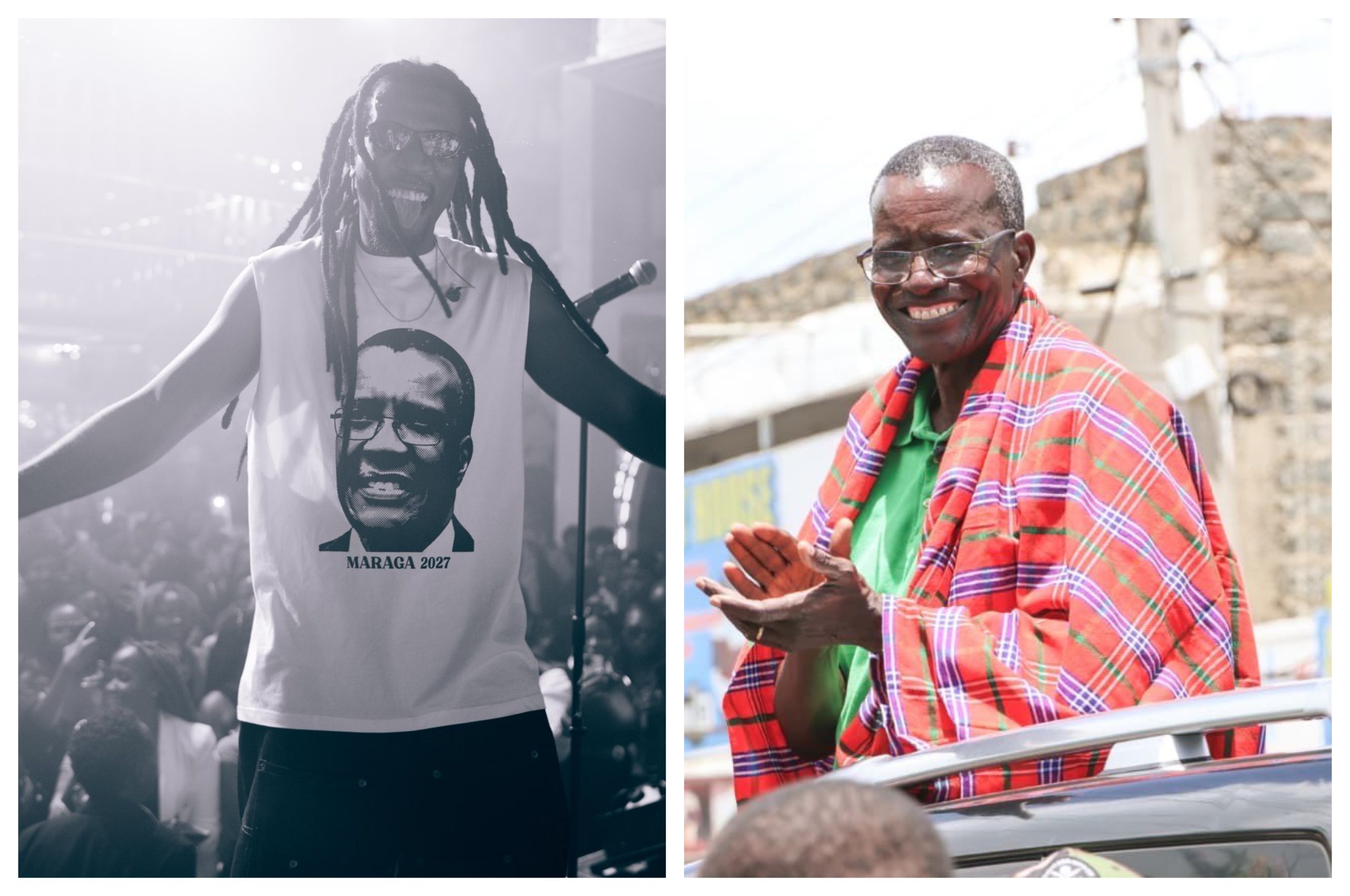 During a high-energy performance in front of thousands, Captain Charisma took to the stage wearing a white sleeveless t-shirt. The front of the garment featured a prominent black-and-white portrait of David Maraga with the bold text “MARAGA 2027” printed directly beneath it.